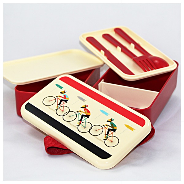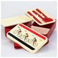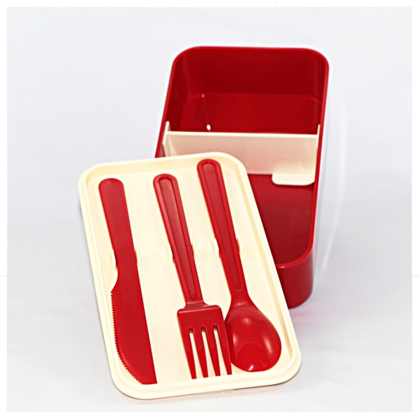 Bestehend aus 2 Dosen je mit Deckel, Besteck (Messer, Gabel und Löffel) und Trennsteg sowie Sicherungsband